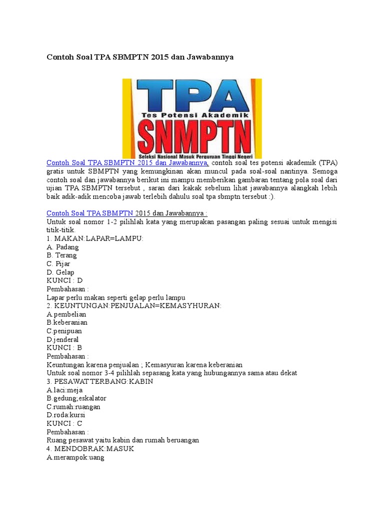 Contoh soal tpa sbmptn 2015 dan jawabannya contoh soal tes potensi akademik tpa gratis untuk sbmptn yang kemungkinan akan muncul pada soal soal nantinya. Admin sbmptn monday may 09 2016. Contoh soal tpa sbmptn 2015 dan jawabannya contoh soal tes potensi akademik tpa gratis untuk sbmptn yang kemungkinan akan muncul pada soal soal nantinya.