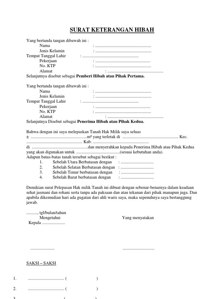 Apabila hibah diberikan kepada anak di bawah umur atau orang yang tidak waras akal pikirannya, maka harus diserahkan kepada wali jika anda menghibahkan tanah atau menerima hibah tanah dari orang lain, maka anda dan pihak lainnya bisa membuat surat hibah seperti contoh di bawah ini jika anda memiliki tanah berupa warisan dari orang tua 5. Namun jika hibah tersebut tidak disertai dengan surat keterangan hibah, maka bukan tidak mungkin akan terjadi permasalahan di kemudian hari, dikarenakan beberapa hal. Pada artikel ini, kami menyajikan beberapa contoh surat hibah rumah dan tanah, diantaranya adalah. Hibah orang tua terhadap anak sebagai upaya untuk itulah yang dapat kami bagikan terkait contoh surat hibah tanah dari orang tua ke anak. Yang bertanda tangan di bawah ini: